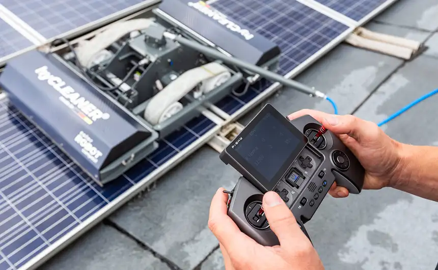 Reinigungsroboter arbeiten automatisiert und eignen sich besonders für große, zusammenhängende Flächen wie Gewerbedächer oder Freiflächenanlagen.