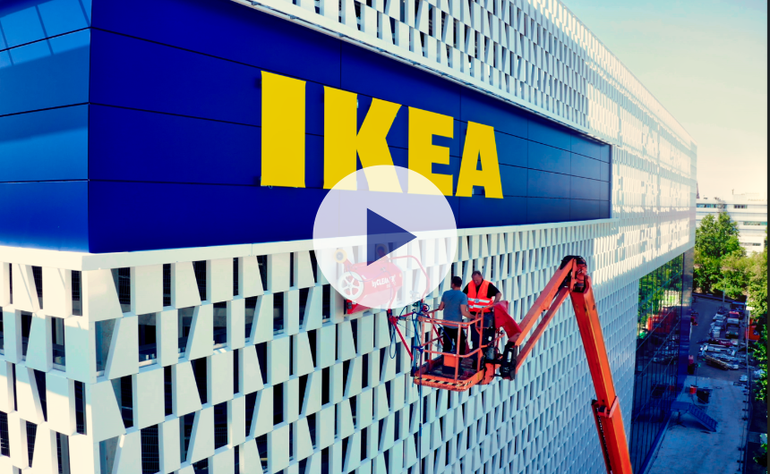 Le robot de nettoyage facadeBRUSH v-line nettoie une façade de bâtiment IKEA